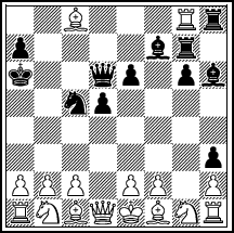 und 15 schwarze Züge entstanden ist. Diesmal sind es die 16 weissen Züge, die allesamt im Diagramm sichtbar sind. Die Schwierigkeit der Lösung besteht darin, die sBB so umzuwandeln, dass sie und die entstehenden Figuren die weisse Rochade nicht stören. Schwarz muss wie gewohnt möglichst rasch die weisse Stellung deblockieren: 1.h4 d5 2.h5 d4 3.Th4 d3 4.Tf4 dxc2 Nun kann Weiss den Damenflügel öffnen: 5.d4 a5 6.Sd2 a4 7.Sdf3 a3 8.Sh4 axb2 Wieder ist ein Riegel im richtigen Moment aufgegangen. 9.a4 Wie kann Schwarz in den verbleibenden 7 Zügen zwei Bauern umwandeln, die entstehenden Steine so verstauen, dass Weiss rochieren kann, und diese Steine auch noch opfern? b1=S! 10.La3 c1=L! 11.Db3 Le3!! 12.Db6 Sd2!! Das indische Manöver ist die Lösung: ein Stein überschreitet einen Schnittpunkt, um sich durch den andern verstellen zu lassen ... 13.0-0-0 ... der die Linie wieder öffnet, nachdem die Verstellung genutzt worden ist: Sb1+ 14.Kxb1 Und plötzlich hat Schwarz sogar zuviel Zeit und muss einen Wartezug einschalten: Ld2 15.Ka2 Lc1 16.Txc1 |