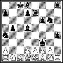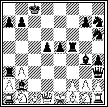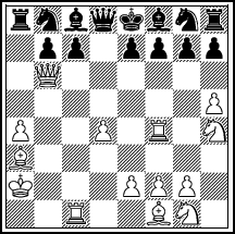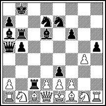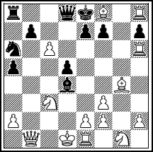 und 15 schwarze Züge entstanden ist. Diesmal sind es die 16 weissen Züge, die allesamt im Diagramm sichtbar sind. Die Schwierigkeit der Lösung besteht darin, die sBB so umzuwandeln, dass sie und die entstehenden Figuren die weisse Rochade nicht stören. Schwarz muss wie gewohnt möglichst rasch die weisse Stellung deblockieren: 1.h4 d5 2.h5 d4 3.Th4 d3 4.Tf4 dxc2 Nun kann Weiss den Damenflügel öffnen: 5.d4 a5 6.Sd2 a4 7.Sdf3 a3 8.Sh4 axb2 Wieder ist ein Riegel im richtigen Moment aufgegangen. 9.a4 Wie kann Schwarz in den verbleibenden 7 Zügen zwei Bauern umwandeln, die entstehenden Steine so verstauen, dass Weiss rochieren kann, und diese Steine auch noch opfern? b1=S! 10.La3 c1=L! 11.Db3 Le3!! 12.Db6 Sd2!! Das indische Manöver ist die Lösung: ein Stein überschreitet einen Schnittpunkt, um sich durch den andern verstellen zu lassen ... 13.0-0-0 ... der die Linie wieder öffnet, nachdem die Verstellung genutzt worden ist: Sb1+ 14.Kxb1 Und plötzlich hat Schwarz sogar zuviel Zeit und muss einen Wartezug einschalten: Ld2 15.Ka2 Lc1 16.Txc1 |
